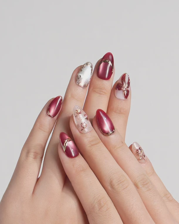 A statement of elegance in deep scarlet and gold. These handmade press-on nails blend a glossy cat-eye finish with gold-lined rose patterns and a sculpted 3D bow, bringing luxurious charm to any celebration. Perfect for festive gatherings, dinner parties, or daily wear when you want to feel effortlessly refined. Crafted with care for a salon-level glow and fully customizable to your preferred shape, length, and size.