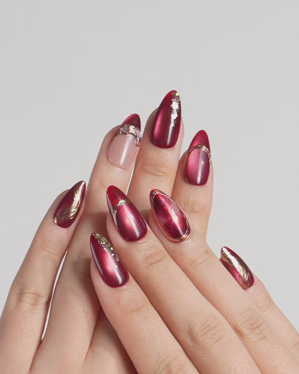 This red cat-eye press-on nail set features a gradient shimmer with gold accents and fine edge detailing. The ombre and reflective finish create a refined yet festive charm. Handmade, customizable, and reusable—ideal for holidays, parties, or any luxe getaway.