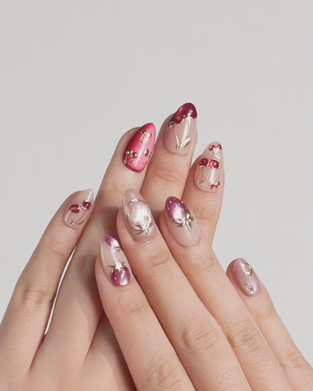 This handmade luxury nail set captures the essence of holiday sweetness. The glossy cat-eye red pairs beautifully with golden cherry and strawberry details, creating a unique blend of elegance and playfulness. Perfect for festive dinners, date nights, or gifting, it delivers a salon-level shine and fully customizable fit.