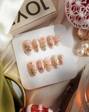 These gold Christmas nails blend luxury and warmth with delicate tree, bow, and star designs. Finished with glitter and glossy edges, this nude-gold set brings refined sparkle to your winter look—perfect for holiday gatherings, festive dinners, and elegant celebrations.