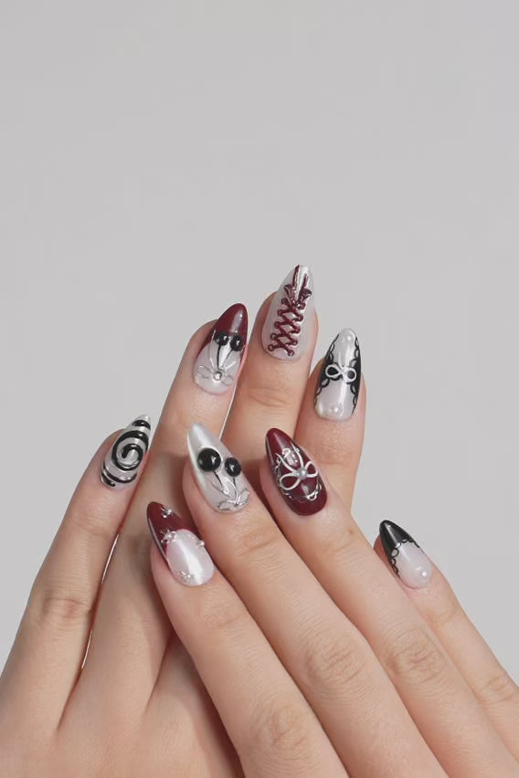 Celebrate Halloween with these playful bunny-inspired nails in black, red, and white. Featuring 3D elements, cherries, lace-up details, and bows, they bring a fun yet chic touch to any outfit. Handmade with care and customizable in shape and length, this set is also reusable—perfect for Halloween parties, cosplay events, and themed nights.
