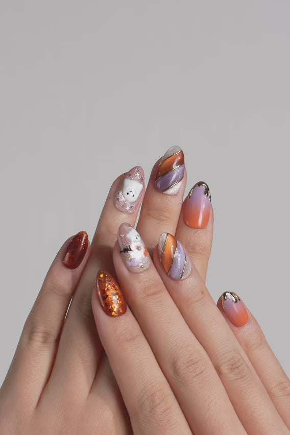 Celebrate Halloween with these cute ghost and pumpkin nails in vibrant orange, purple, and gold. Featuring cat eye shimmer, gradient transitions, and chrome accents, each nail is handmade for a chic and playful vibe. Customizable in shape and length, this extra short almond set is also reusable—perfect for parties, cosplay, and festive looks.