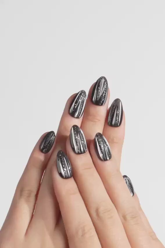 Minimalism meets structuralism. We combined black vertical 3D lines with subtle glitter strips. The vertical design visually elongates your fingers, creating a sleek, powerful silhouette. It creates a "Boss Energy" look that pairs flawlessly with a sharp blazer or evening suit.