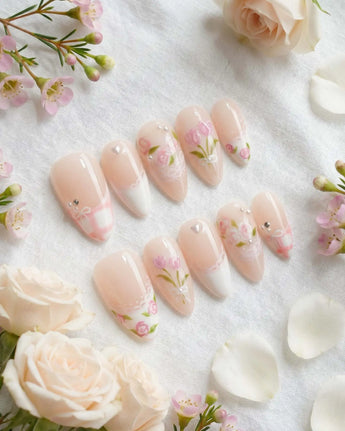 This is what it looks like when a cottage garden decides to show up on your hands. On a soft nude glassy base, hand-painted pink roses and tulips bloom across select nails — each one painted with the kind of unhurried attention that makes you want to look closer. White lace scallop borders frame two nails; a soft pink gingham pattern sits on another. A satin ribbon bow, painted in three-dimensional detail, rests at the cuticle of the accent nail, paired with micro pearl beads and tiny rhinestone accents that catch light without demanding it. The palette stays within the softest possible range of blush, white, and sage — the colours of a windowsill in April with something growing on it. This is the set for garden parties, engagement celebrations, Sunday brunches where you take the long way home.