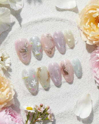 You know that particular kind of stillness you feel watching koi fish move through water — the way they drift without urgency, catching light on their scales, changing direction for no apparent reason? This set bottles that feeling. Aurora-tinted bases in blush, silver, lavender, and mint shift colour the way sunlit water does, each nail holding a slightly different temperature of light. Gold and rose-gold sculptural metal charms rest at the cuticle like koi suspended mid-drift: weightless, unhurried, present. Hand-painted confetti blooms and a single white flower break the surface the way lotus petals do — appearing where you don't quite expect them. The overall effect is simultaneously serene and alive. It wears beautifully with light summer fabrics, anything flowing, or simply held still in your hand as a reminder that ease is also a practice.