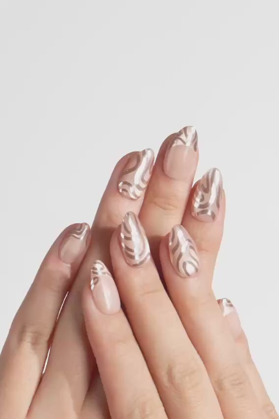 A unique blend of sci-fi texture and minimalism. On a nude base, we layered Champagne-Green cat-eye and light champagne chrome to create winding, concentric lines. It looks like a glowing road or tree rings made of light. The interplay of two different glowing textures—magnetic and metallic—creates a look that is flat but visually deep, sophisticated, and rare.