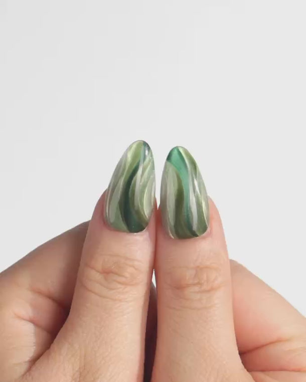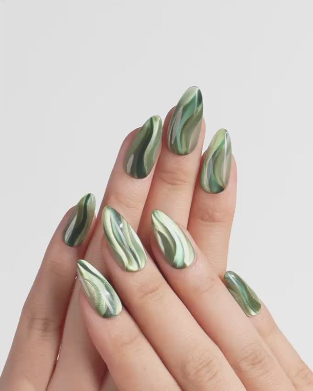 Verdant Ribbons captures the glow of forest light — a green cat-eye that moves like silk when you tilt your hands.