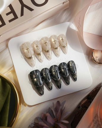 Inspired by the contrast of champagne light and black-gold radiance, this set creates a dual-hand effect—one glowing warm, one glowing dark—connected by a sculpted cross that radiates like a halo. It feels sacred yet fashion-forward, perfect for parties, concerts, or anyone who loves dramatic contrast styling. Pair with black coats, metallic bags, or bold makeup for an unforgettable look.