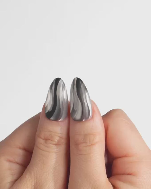 This design reimagines dark satin ribbons—those soft, folded shadows you see on evening gowns—through a smoky grey cat-eye that shifts like fabric moving under dim light. Cool, sleek, and modern, it pairs beautifully with leather jackets, silver accessories, or night-out looks that need a touch of quiet drama.