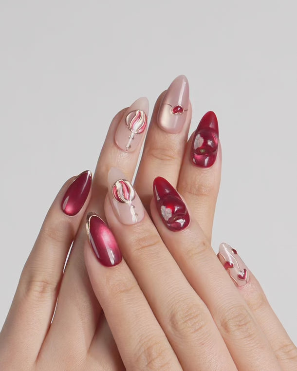Dieses weihnachtlich inspirierte rote Press-On-Nagelset kombiniert glänzende Cat-Eye-Effekte mit 3D-Apfel- und Ornamentdetails. Mit feinen Goldlinien und modellierten Gel-Designs akzentuiert, ist es sowohl schick als auch festlich – perfekt für gemütliche Wintertreffen oder rauschende Weihnachtspartys.