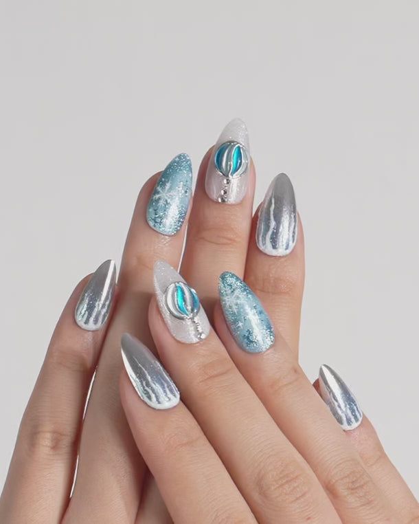 Diese eisblauen Weihnachtsnägel fangen den Schimmer eines Wintermorgens ein – mit Schneeflockenmustern, silbernen Chromdetails und Kristallkugel-Akzenten. Die frostigen Blautöne und das funkelnde Glitzer-Finish verleihen jedem Feiertags-Look einen Hauch von Fantasie und Eleganz – perfekt für Weihnachten, den Winterurlaub oder Mottopartys.