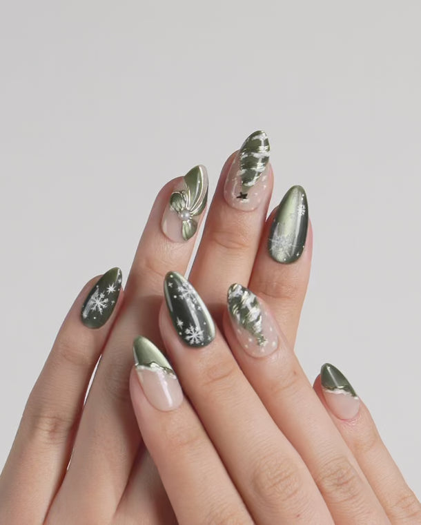 Diese grünen Weihnachtsnägel zeichnen sich durch satten Katzenaugen-Schimmer, goldene Schleifen, Schneeflocken und Baumakzente aus und sorgen für einen luxuriösen Feiertagslook. Der tiefe Smaragdton harmoniert perfekt mit Nude- und Golddetails – ideal für Weihnachtsfeiern, Wintertreffen oder den eleganten Alltag.