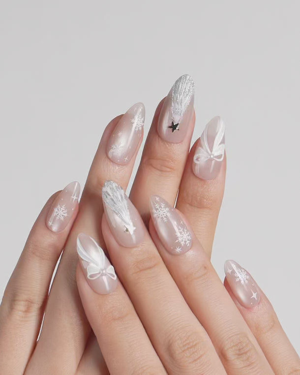 Diese nudefarbenen Weihnachtsnägel versprühen mit weißen Schneeflocken, Schleifen und kleinen Sternen einen minimalistischen Wintercharme. Der Cat-Eye-Schimmer und die dezenten 3D-Weihnachtsbaumdetails verleihen Ihrem Festtagslook elegante Tiefe – perfekt für den Alltag, gemütliche Zusammenkünfte und stilvolle Weihnachtsfeiern.