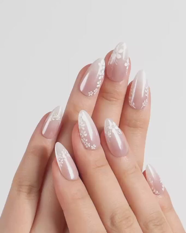 Start your love story with a clean slate. We blended a seamless milky ombre that mimics the morning light filtering through sheer curtains, finished with delicate, hand-painted vines climbing towards the sun. It captures the intimacy of a Sunday morning—pure, effortless, and full of promise.