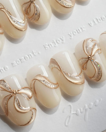 The coquette aesthetic is built on one central idea: that a carefully chosen detail can do more than an entire outfit. This set understands that. A clean cream-white base — warm, smooth, the colour of good writing paper — holds rose-gold sculptural ribbon bows at the centre of each nail, sculpted with raised edges and diamond-cut detail lines. Micro pavé sparkle runs along every edge of every bow, catching light the way rhinestones on a vintage evening glove do: at the edges, in motion, never flat. The lines extending from each bow aren't decoration — they are the ribbon itself, mid-flow, as if someone has just tied it. Deeply current and built to last beyond the trend, because the bow itself is timeless. These are the nails for the person who believes that the finishing touch is actually the whole point.