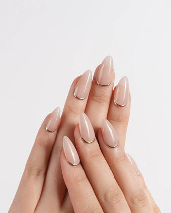 The Design: The ultimate "Clean Girl" look. A nude base that matches natural skin tone, framed by a delicate gold line at the cuticle.