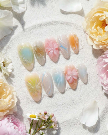 Some springs are subtle. This is not that spring. Aurora gradient bases shift from chartreuse to aqua to coral pink to warm amber across the set — each nail a different temperature, a different intensity, a different version of the same explosive season. On certain nails, translucent white butterflies with fully detailed wing veins are painted directly into the shimmer base, their near-invisibility making them feel discovered rather than placed. On others, sculptural 3D flowers in soft pink bloom with pearl centres — tactile, dimensional, alive. Two nails carry fine hand-painted blue lines that move like refracted light through a crystal prism. The overall effect is the visual equivalent of a dopamine spike: joyful, unapologetic, made for full saturation. For the person who has always reached for the most colour in the room and felt completely right about it.