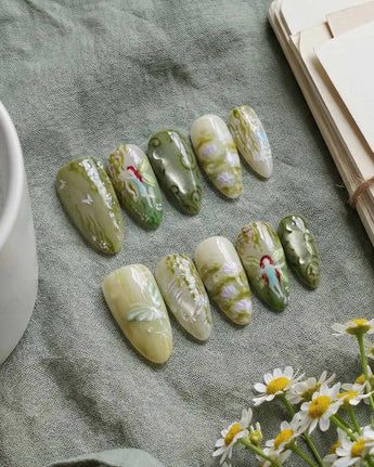 Deep olive, muted sage, and pale celadon layer across each nail in the style of a living forest after rain — colours that shift depending on the light, the angle, the time of day. Set within the green: a hand-painted fairy caught mid-flight, wings outstretched, moving between white woodland wildflowers that are only half-visible in the undergrowth. On one nail, a butterfly rests. On another, a bloom breaks through. Flickers of warm gold are buried in the paintwork like light filtering through tree canopy at golden hour. This is the design for the person who picks the mushroom foraging tour over the spa, who reads the fantasy novel instead of the thriller, who finds real magic more interesting than the convenient kind. Every nail tells a different piece of the same story.