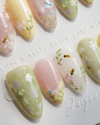 Wear a living, breathing garden on your fingertips. The Honey Meadow set is pure cottagecore joy, bringing a vibrant spring micro-ecosystem to life. Painted across a soft, cheerful palette of pastel pink, sunlit yellow, and fresh meadow green, this set is packed with artisan details. You’ll find meticulously hand-painted bumblebees mid-flight, delicate white daisies, and trailing green vines. To finish the look, we added realistic 3D clear gel dew drops that look like fresh morning rain. It’s a joyful, mood-boosting masterpiece that pairs perfectly with your favorite floral dress and a sunny afternoon.